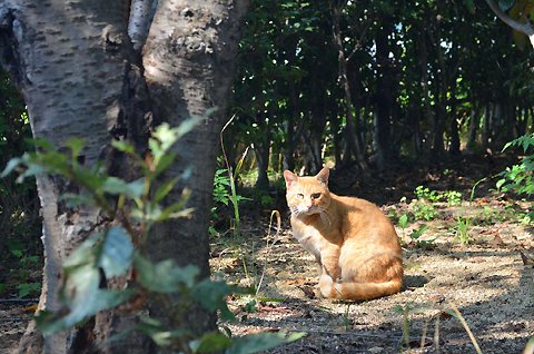 林内で過ごすふうらいさんもお日様の当たる場所を選ぶ季節になりました こうして見ると はでな赤猫さんも強い木漏れ日に似た保護色であることが分かるような気がします