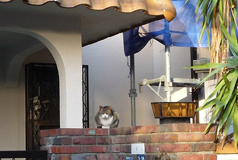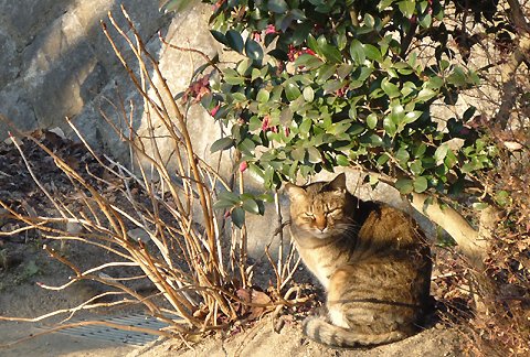 お日様が昇るのを待ちこがれていたはずのネコですが お日様が通り過ぎてもまだ動こうとしません  あまりに寒くて動く気になれないのかも知れません