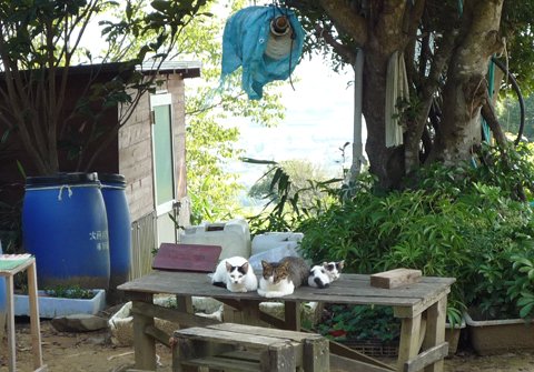人里離れた山中のお家に飼われている?猫家族。涼しい庭のテーブルで、家族揃って“川”の字ならぬ“小”の字に寝ています。
