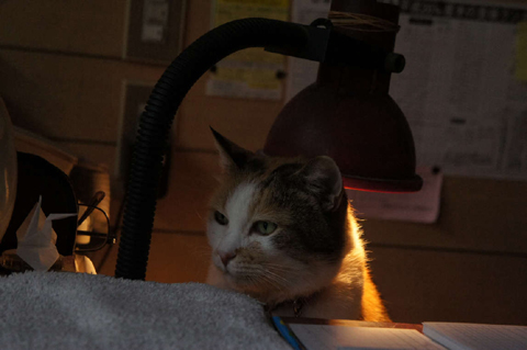 日勤外猫の受付係さんは今日も真面目にお仕事です。暖房は電気スタンドです。