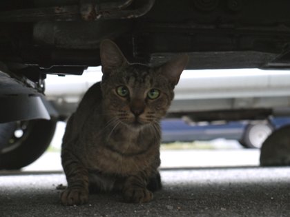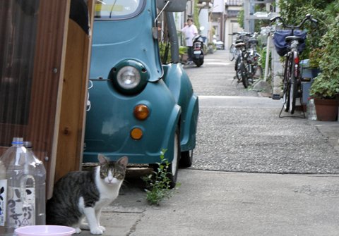 変わった形の車が停まっています。車は変わっていますが、ヒトもネコもいつもと変わらぬ朝を迎えているようです。
