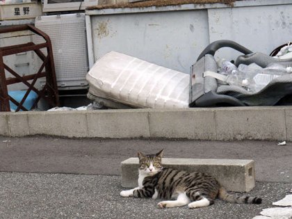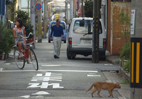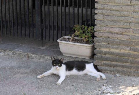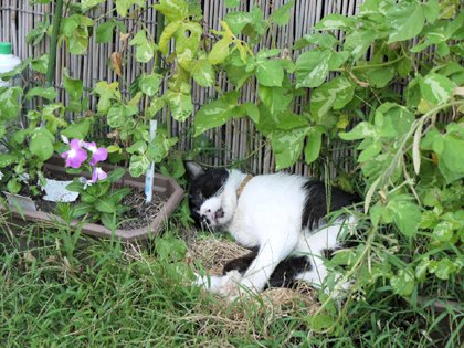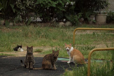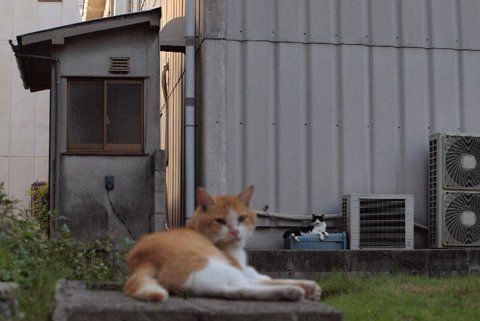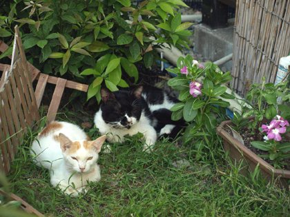 夕涼み。  空地が全部陰になってほんの少し暑さが和らぐころ、老いも若きも夕涼み、猫にも楽しい一時です。