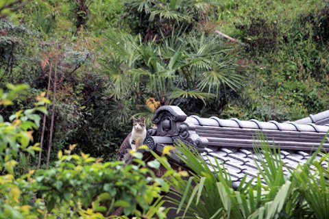 山麓の民家の屋根の上に、見たようなネコが現れました。似ていますが、よく見ると初めて見る顔です。しかもふうらいのようです。