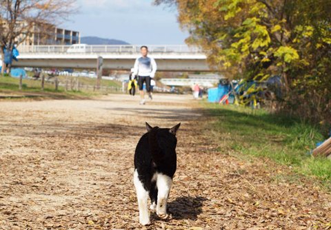 晴れた日曜日の河川敷公園、少年の脚が弾めばネコの脚も弾みます。