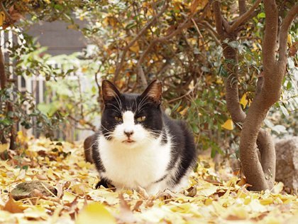 晩秋の公園を美しく彩ってくれるイチョウの葉、けれども、水分が多くて燃えにくいイチョウの葉は掃除をする人達を悩ませてきました。落ち葉の布団に乗ってしゃがむネコにも、イチョウの葉は冷たくてあまりいいものではありません。