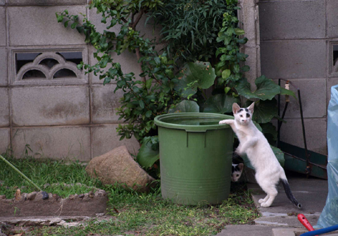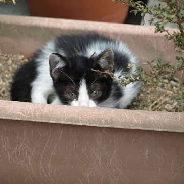 猫は箱のような狭いところに入るのが好きです。古いプランターの中には子猫が寝ています。けれども、よく見ると汚れたプランターの壁面には沢山の爪跡が着いていて、しかも大小様々です。どうやら複数の猫が頻繁に利用しているようです。
