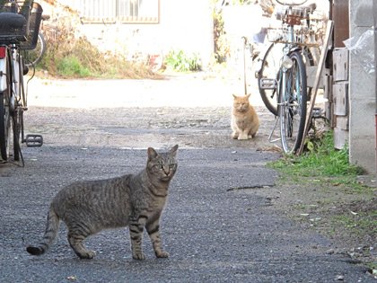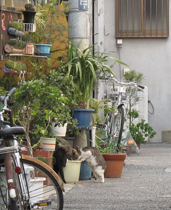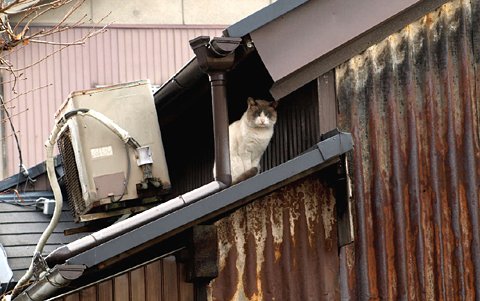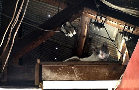 実はつい先日まで路地裏の商店街があって、路地の上には屋根組とトタン屋根(つまりアーケード)があり、タカシ君は屋根組の梁の上で暮らしていました。買い物に来る人達と店のおっちゃんやおばちゃんのやり取りを見下ろすのがすきでした。